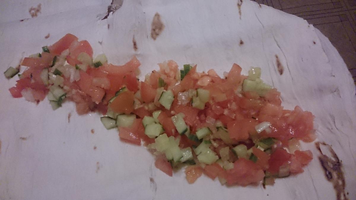 на питу или лаваш выложить мелко нарезанное обжаренное мясо дичи, добавить мелко порубленную зелень(лук,помидоры,огурец.....)