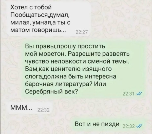 - Да я сейчас насмотрелась на таких, как ты и понимаю, что Душ не такой уж куколд, а Благовест не такой уж говнюк.