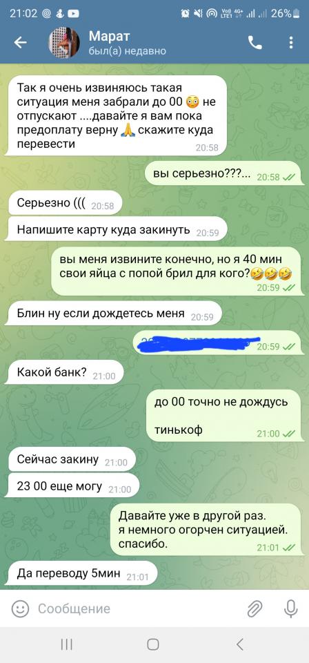 скинув предоплату на визит на час в гостях, в какое то момент предложил посетить меня на 2 часа и такси комфорт плюс.