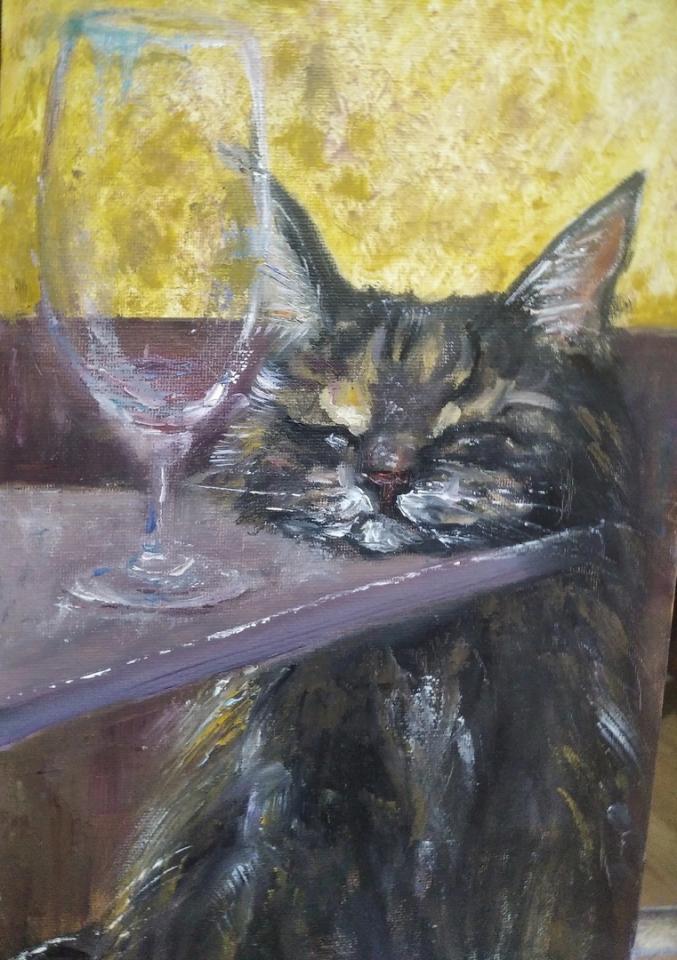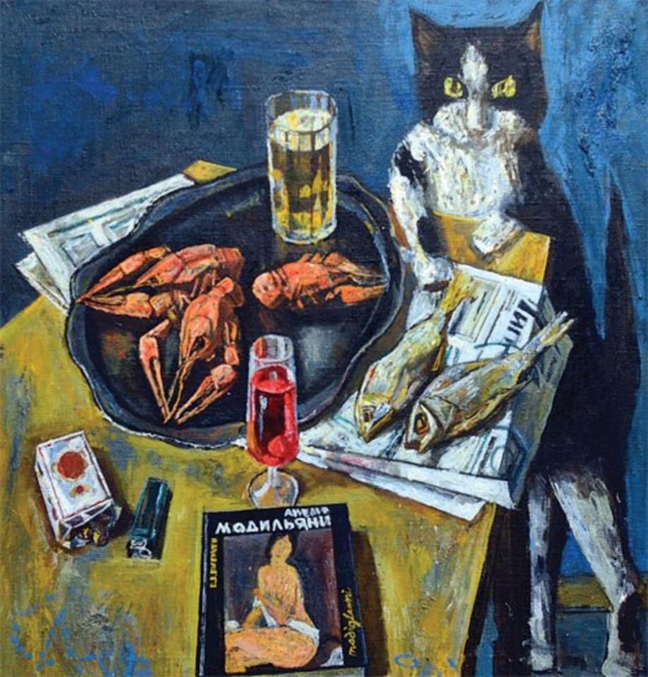 - Помню, он скомпоновал этот натюрморт, одолжив книгу Модильяни у кого-то из знакомых художников. Модильяни, надо сказать, пользуется огромным почётом у супруга. Так что тут - своеобразный респект таланту прославленного мастера. Особый же шарм сюжета, по словам Александра Михайловича: есть и выпить, и закусить! Там и вино, и пиво, и раки, и рыба. А кот по имени Виктор Семёнович (догадайтесь, в чью честь) обожал садиться где-нибудь неподалёку, когда муж работал. Он запросто мог украдкой стащить что-нибудь из выстроенной композиции. И этот любопытный кот сам стал частью натюрморта, который Александр Михайлович написал буквально минут за сорок.