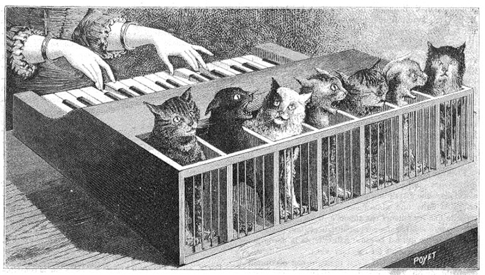 Оно состояло из нескольких кошек, закрепленных внутри инструмента, а их хвосты были вытянуты в клавиатурный отсек. Хвосты котов с разными тонами мяуканья помещались в отдельные ячейки. Специальные рычаги тянули котов за хвост при нажатии на клавишу, в следствии чего те истошно вопили, создавая незамысловатые мелодии. Считалось, что такой инструмент может помочь в лечении меланхолии, так как отвлекал больных ею от постоянного уныния и оживлял обстановку. До сих пор ходят слухи о том, что в 1549 году Филипп II, король Испании, наслаждался музыкой кошачьего пианино, а Петр I даже заказал себе такой инструмент для Кунсткамеры.