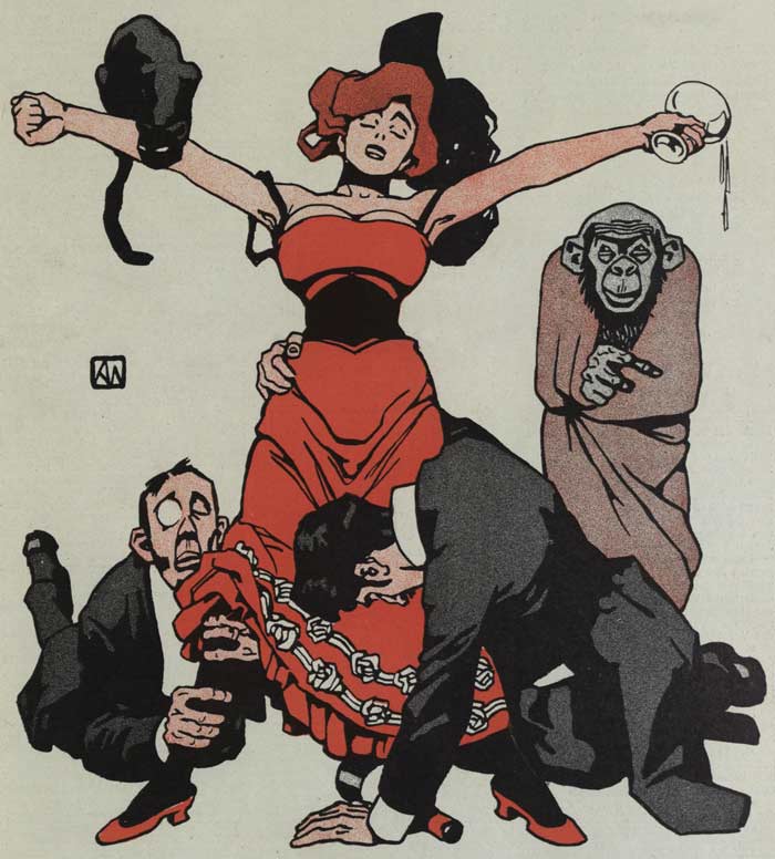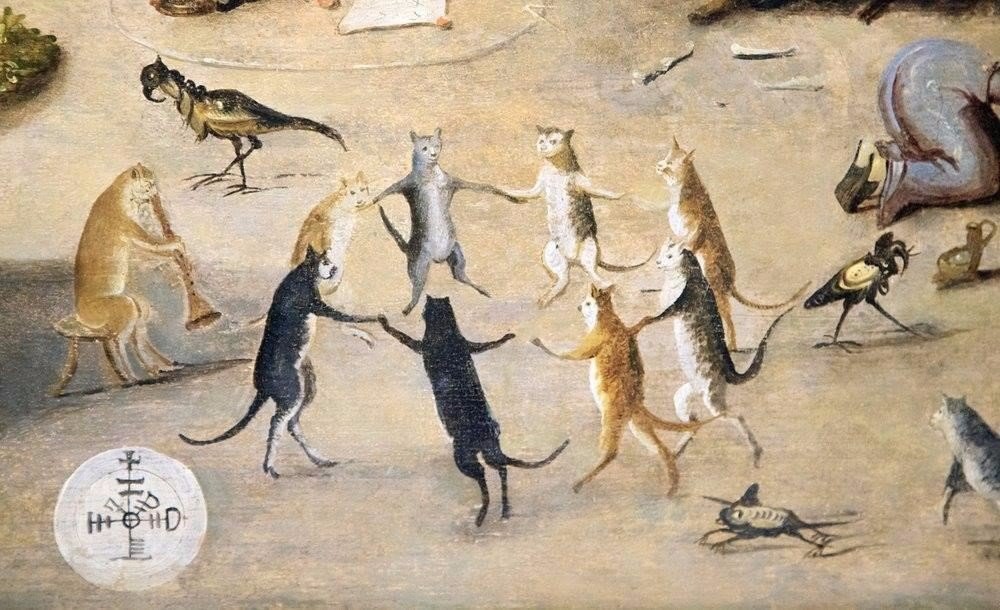 Фрагмент с сатанинским танцем котов с полотна 16 века за авторством фламандца Яна Мандейна.