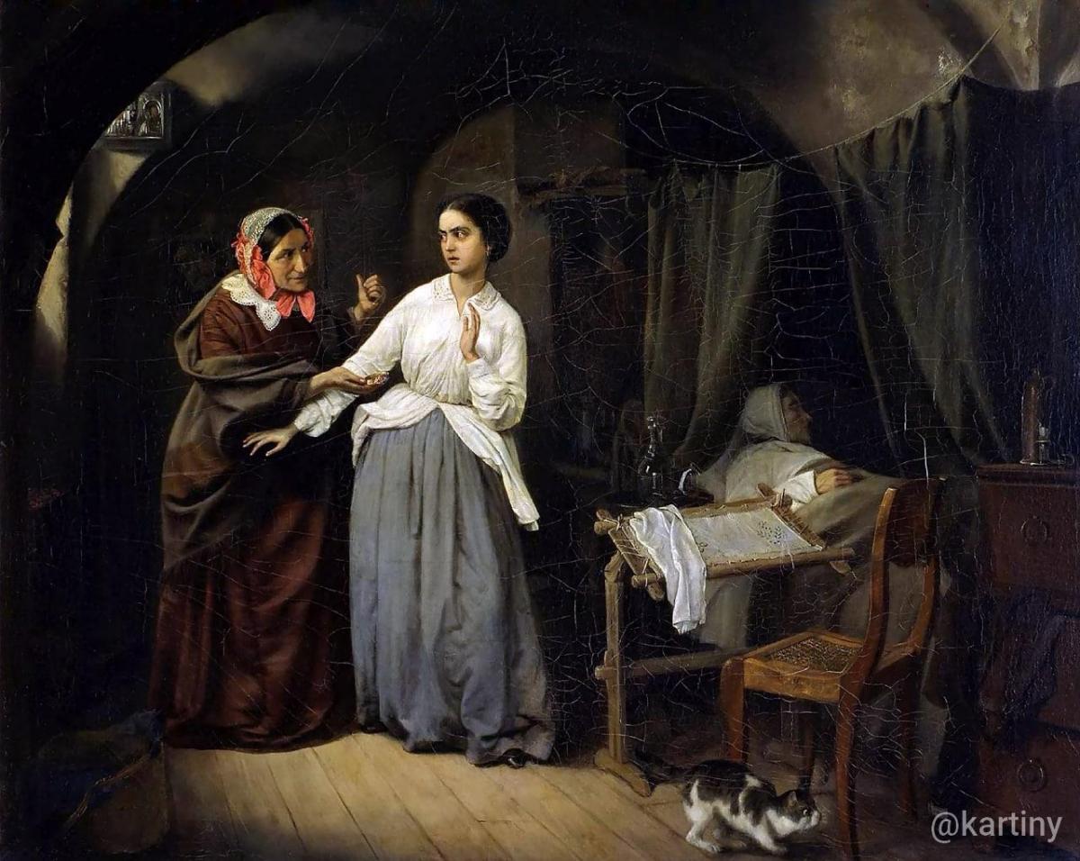 На картине мрачная и сырая подвальная комната, в которой живет девушка и ее престарелая больная мать, давно уже не встающая с постели.