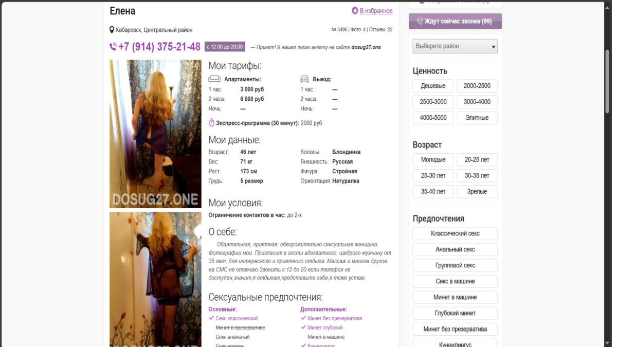 Внесу свои 5 копеек по этой даме. По возрасту уже далеко за 40, но ухоженная, спору нет. За фигурой следит, грудь сделана. Кожа, волосы, все неплохо. По фото узнаваема, вау эффекта конечно не будет, как описал камрад, но в целом приятная дама, отторжения не вызывает. Второй раз посетить можно. По процессу, заходил на минет, вот тут уже двоякое впечатление. Из плюсов, начала отсос не с гондона на вялого, чем грешат многие, а с вылизывания яиц, это конечно же признак высокого уровня. Но когда перешла на член, восторг поугас, сосет интенсивно, торопливо и проскакивают зубы! По итогу следы остаются, это уже увидел после. Можно погонять шланг промеж сисек, но недолго. Выносливость это не ее сильная сторона. Если кончаете дольше обычного, будет поторапливать, спрашивать кончаешь ли ты от минета и долго ли еще. В конце уже скатилась в дрочку, но направил ее язык на шары. Далее финальный выстрел, после которого еще немного дососала. В целом чисто на минет не рекомендовал бы, а секс мною востребован не был.
