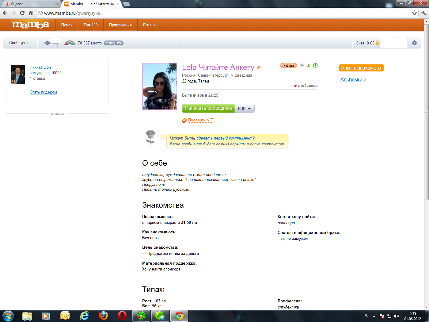 давно присматривался..приглядывался..принюхивался...смущала "обязаловка" на первые два часа...но тут вмешалась судьба в виде слияния таких факторов как...занятость моих проверенных девчонок(работа, дача, здоровье)...желание попробовать чего-то нового, бюджетного (только с Украины приехал - финансы плачут), но при этом зачетного...и попавшаяся на глаза тема на Форуме про Лолу (перечитал раза два), где кроме восторгов еще и оказалась, что теперь она принимает и "на часик"...тут у меня развеялись все сомнения...созвон..и я у Лолы (мне вообще этот район очень удобен)...