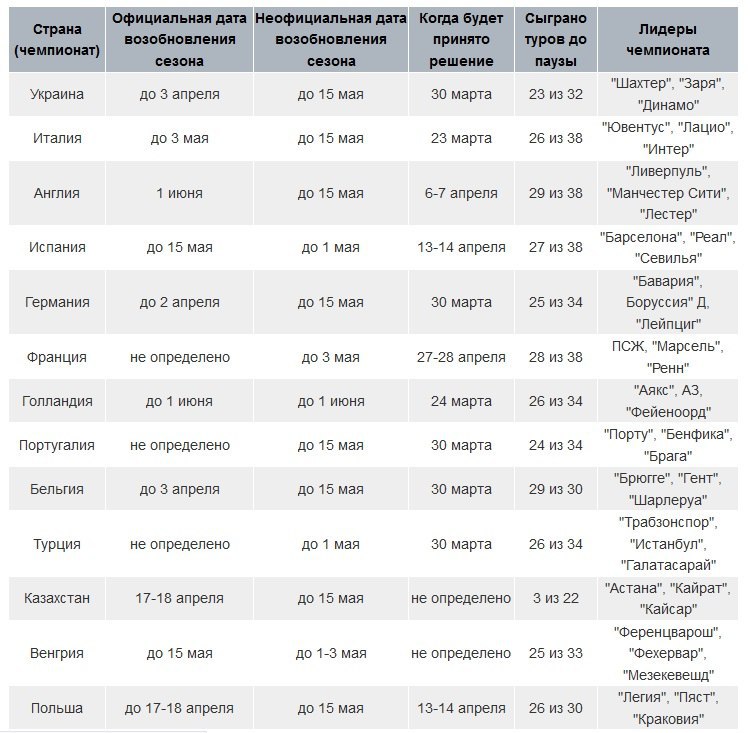 – Чемпионаты и еврокубки должны доиграть до 30 июня, «если ситуация улучшится и возобновление игры будет уместным и разумным».