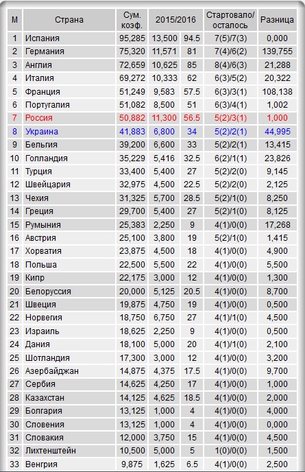 В общем, пока неплохо. Такого рейтинга у нас еще не было. Вот что значит, что все наши 5 клубов выступили на групповом этапе. Это неплохо иллюстрируется следующей таблицей (рейтинг УЕФА по странам):