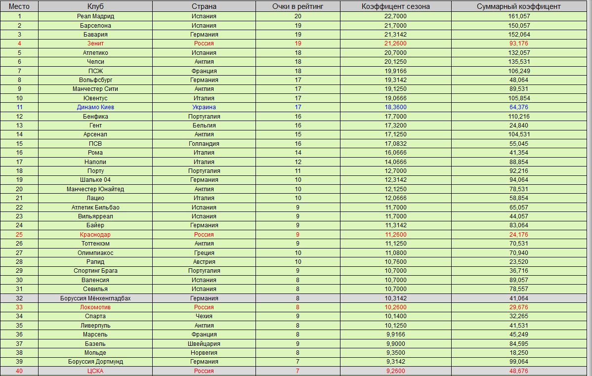 В следующей таблице представлен клубный рейтинг сезона. Впереди Зенита вполне ожидаемо оказались те самые три клуба, которые и разыграют между собой ЛЧ.