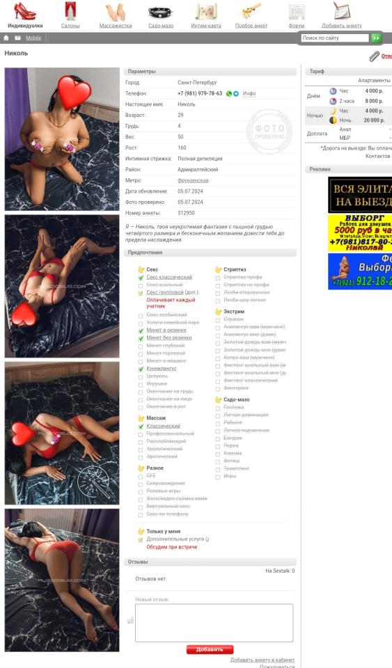 Суть в чем: была одна дева, ну очень мне понравилась, но видимо ушла из индустрии. Тк пропала со всех ресурсов. Но, поиск навел меня на один сайт (да простят меня админы) секс-менеджер инфо, на котором я нашел ту кого надо. Написал в их телегу, с указанием конкретной анкеты. В ответ аудио, что девушка на каникулах но есть куча других. Мне посыпались фото, на что я отвечаю "готов платить, найдите ту". В ответ "она на каникулах". Спустя несколько недель, вновь пишу: в ответ "девушка не работает". Спрашиваю: "А у вас на сайте и неактуальные анкеты есть". В ответ тишина.