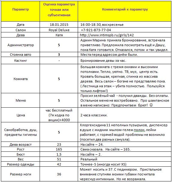 Получил качественную услугу, и сам свидание сумел не испортить. Что хотел – получил. Безупречное по мне создание!!! Зазноба моя, Катюша. Не ходи к ней никто и никогда…[прям демон - убью нахрен, и съем].
