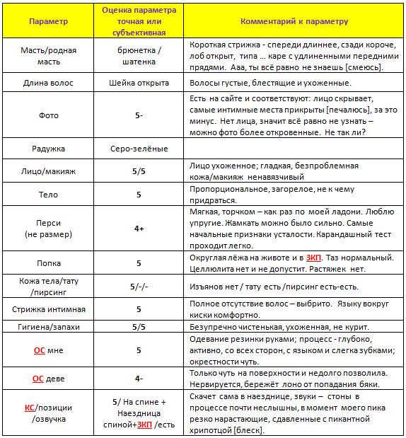 Прическа сейчас вообще не такая - волосы даже не до плеч, а короче, но достаточно пышные, ежик чуть ниже затылка, спереди прямая вроде челка - не знаю как эта прическа называется. И теперь она вроде как не шатенко, а брюнетко(вечно путаюсь в этих названиях - короче волосы черные). Меня вообще админ спросил зачем-то был ли я у Кати до этого, не постоянник ли я её - может хотели мне другую девушку подсунуть?)))