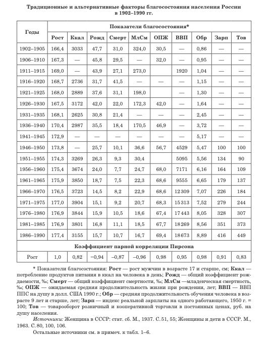 Дальше начинается самое интересное. Когда автор сопоставляет антропометрические ряды с традиционными социально-экономическими показателями, выясняется, что они движутся почти синхронно. Подъёмы и спады совпадают. Статистически это выглядит ещё убедительнее: коэффициенты корреляции между изменениями роста населения и девятью традиционными показателями благосостояния за XX век находятся в диапазоне от 0,83 до 0,98 — то есть близки к максимальным значениям. Проще говоря, когда по официальным данным жизнь становилась лучше, это отражалось и в теле людей; когда наступали кризисы — войны, голод, разруха — тело реагировало столь же наглядно.