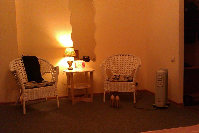 Итак, что мы видим. Слева направо. Кресло, на котором висят мои штаны. Столик с лампочкой. Над столиком волнистое зеркало. В зеркале отражается радиоприёмник. Ещё одно кресло. Около второго кресла туфли, характерного для борделя фасона, рабочая спецобувь. Обогреватель. Это хорошо, в комнате поэтому было тепло.