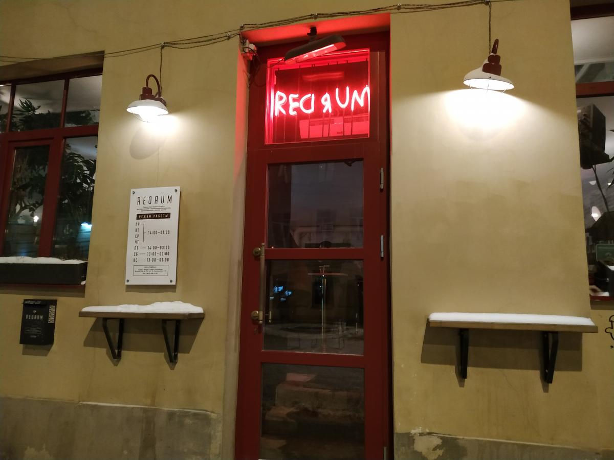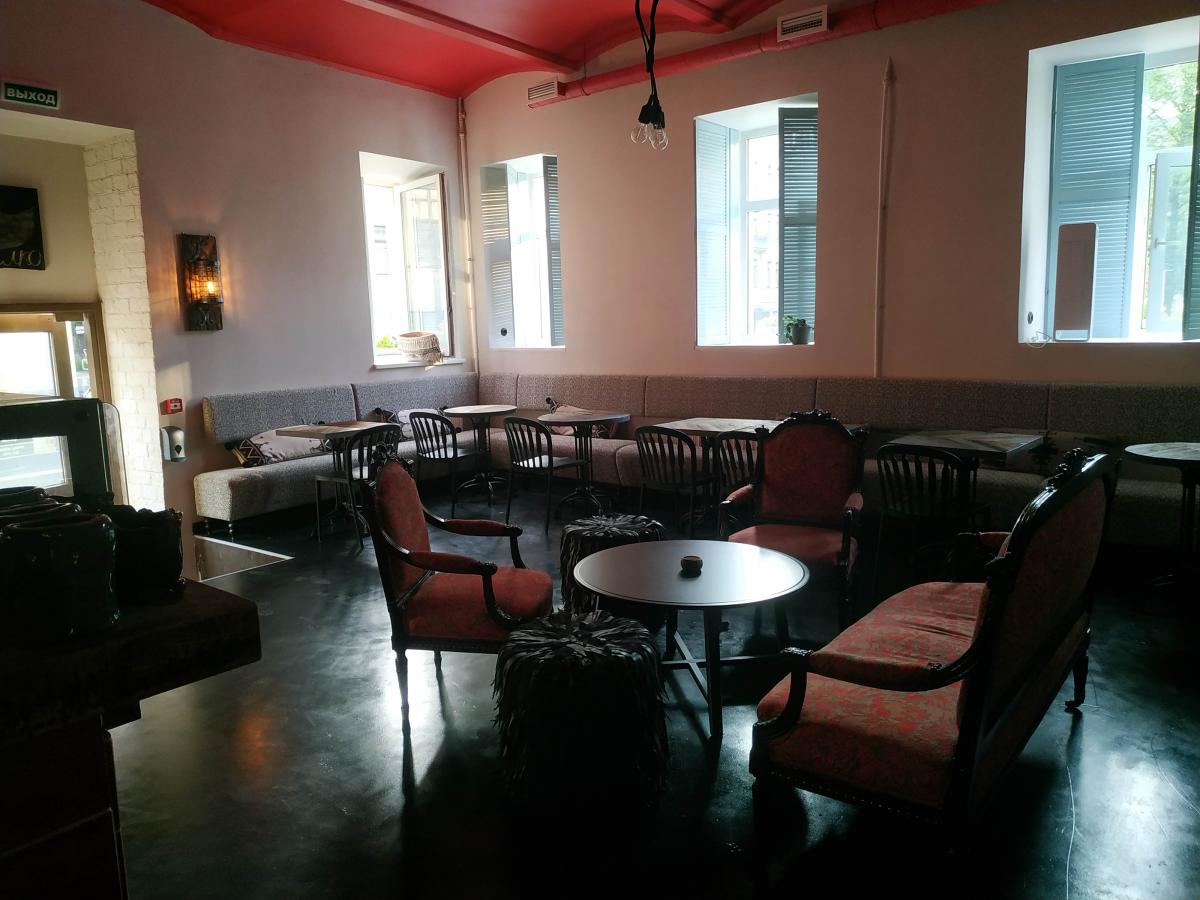 Забегаловка разделена на 2 зоны, и у каждой есть вход. 1-барная, вход с Каменноостровского,2-"ресторанная", вход с Дивенского сада. Столы, стулья, диваны с подушками, в общем интерьер ничем не запомнился, кроме каких-то висящих ковров в зале, там же рояль и патефон с пластинками. Смотрится всё это нелепо.