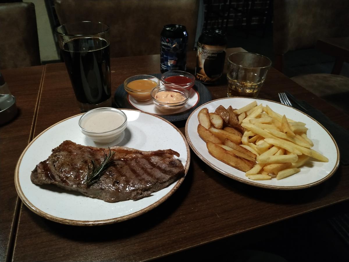 Стейк стриплойн 250гр/750р (подаётся с перечным соусом). Хоть и мираторг, но вполне съедобен. Прожарка медиум.