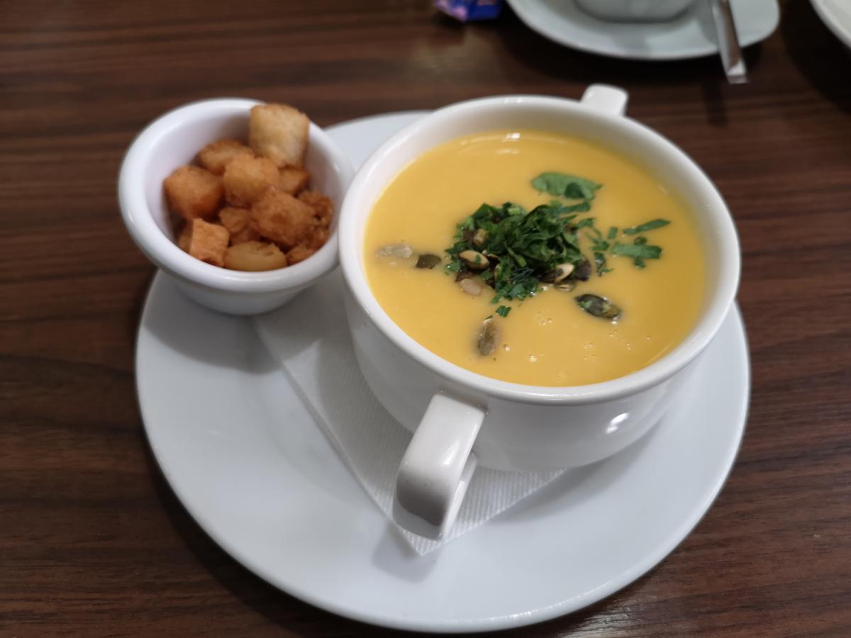 Взял аналог бизнес-ланча: селедку под шубой, суп-пюре из тыквы, медальоны из свинины, чай в чайнике. Без чаевых было бы меньше тысячи.
