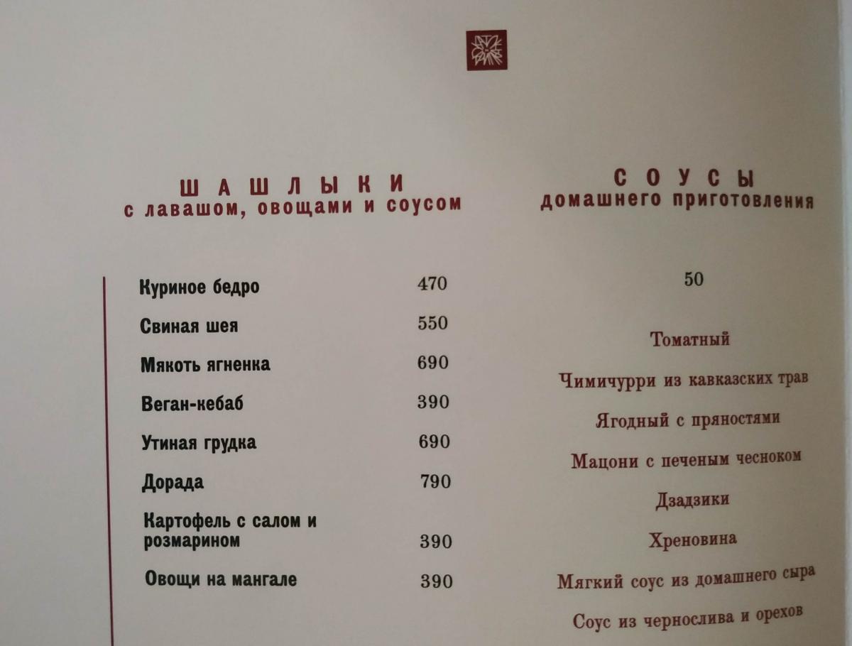 Шашл хуйня полная. Сказали делают на углях, но такое ощущение, что сделали в электрической еболЕ, дымом от него не пахнет. Выглядит белёсо, что-нибудь типа молотой паприки для цвета в маринад не добавляют, да и сам маринад, чувствуется, - не затейлив. Мясо сомнительное, один кусок почти целиком состоял из жира. Рекомендованный официянткой соус мацони - это мерзотный злоебучий кефир с травой. Вино домашнее красное - питкое, мягкие танины, минимум кислятины, градусов на 11.5. Нормальная бормотуха, если бы не цена.