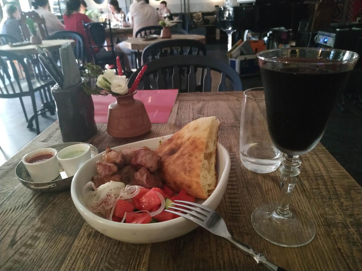 Ел сациви (приготовлено отвратно, хуйня полная, такого плохого сациви ранее не видел), шашлык (принесли куриный вместо заказанного свиного, спорить не стал, так себе шашлычок-с, из зелени лучок и кинза прилагаются). Хорошая острая аджика и отличный смородиновый морс.