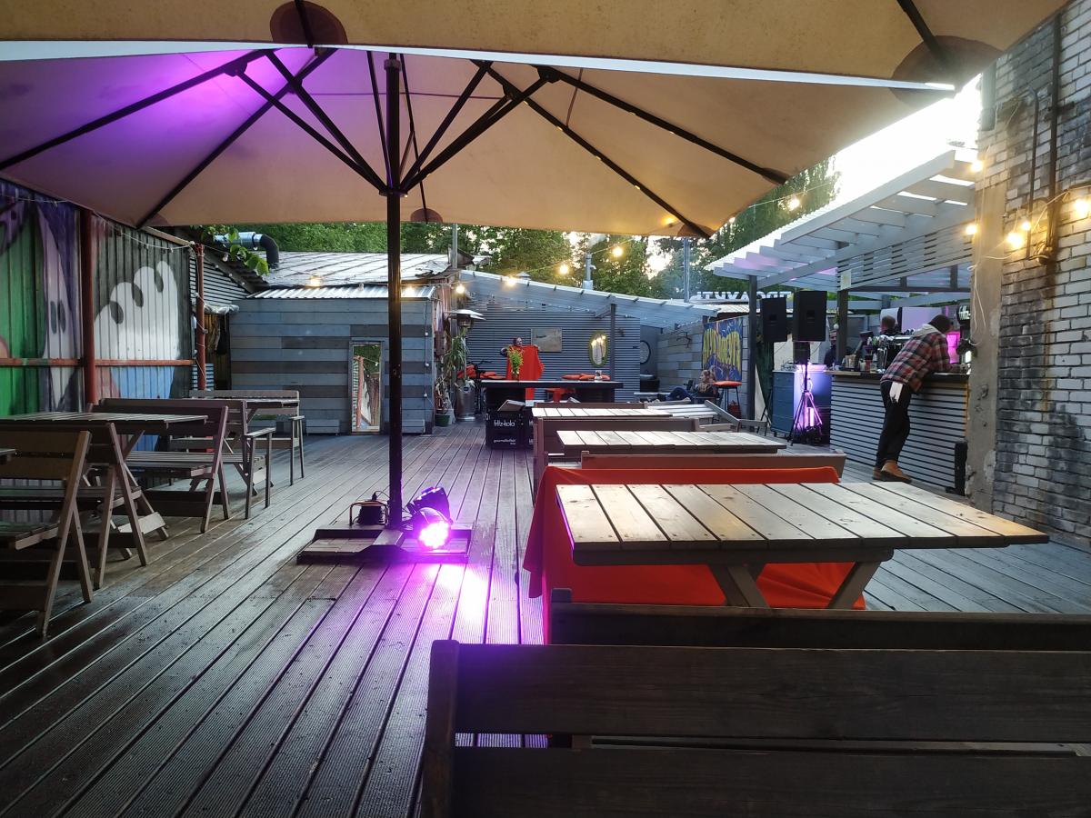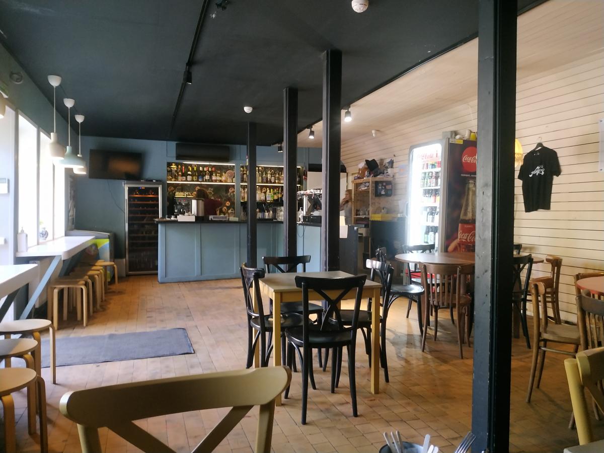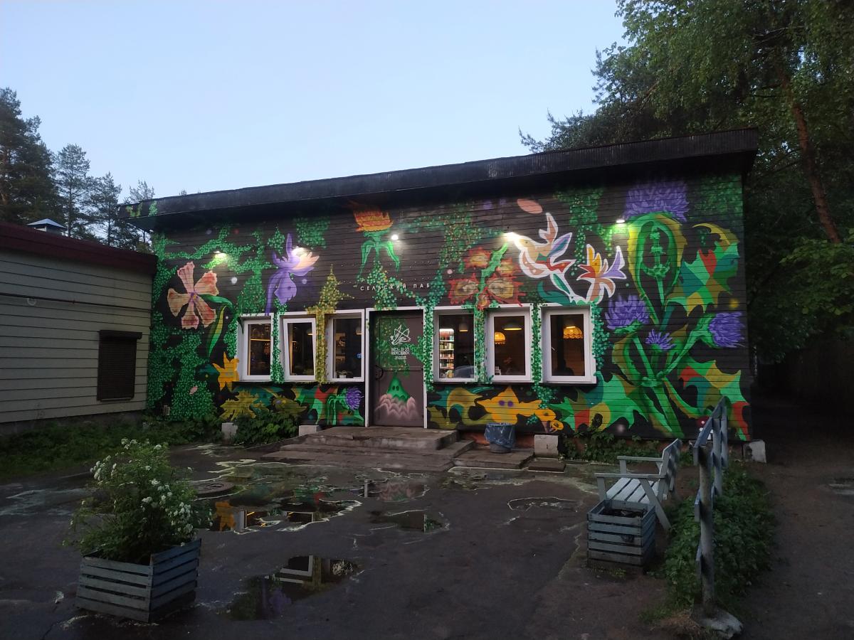 Периодически захожу на обед с начала лета. Заведение популярное, молодёжное. По вечерам шумно, неуютно. Зал + большая терраса на заднем дворе (вход с улицы) Дизайн, оформление, - как если бы родители отдали на поругание большой сарай своим детям подросткам, лесным хиппарям. На террасе разводят кострище у барной стойки, устраивают пляски. Патефон вечерами врубают так что уши болят. По сервису особых замечаний нет. Само строение находится в кустах, метрах в 200х от железной дороги, так что грохота от поездов нет.