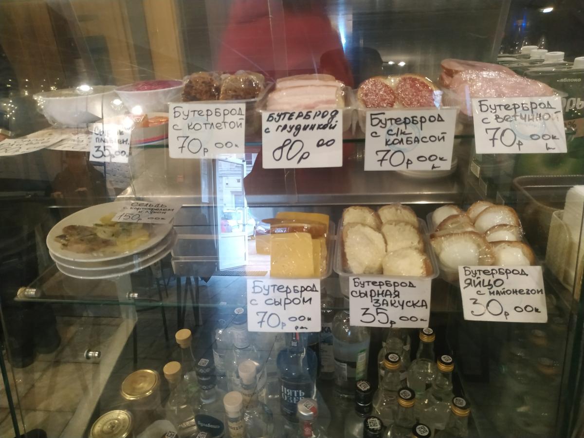 Пиво Жигулёвское (0.5/170р) не советую, ссанина. На эти деньги лучше ещё соточку взять, с соком или бутербродом. Бутербродов много разных, самые нормальные с селёдкой и луком (55р), с колбасой или сыром уже по 60р. С форшмаком тоже за 60р, и можно соблазниться, но он половинчатый, тут надо внимательнее смотреть меню. Из горячего (яичница, жареные пельмени, супы, колбаски, котлета) - ничего не брал. Но оно есть, приносят на стол сами.