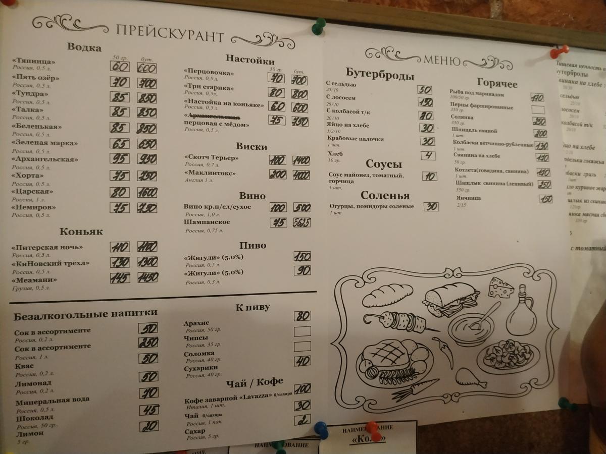 Есть водка "Тяпница" за 120р 100гр. Её брать нельзя, это залупа.В ней 38 оборотов. Пять озёр за 140р 100гр и, нет, не сок, а шикарный малосольный огурчик за 30р. Огурцы у них великолепные, только надо просить, чтобы захватили из миски самый жирный. Огурцы хороши!