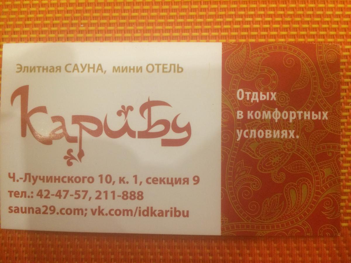 местные показали классное место- типа сауны с номерами, кстати, таких в Петербурге не хватает. Визитку прикреплю. Место очень порадовало, с моей точки зрения это самое комфортное место для вызова девчюль в Архангельске. Находится на первом этаже какого то хитрого типа торгового комплекса, сначала в холл, потом к ним дверь налево. Если направо- ворнинг!!- там кафе с хиппи, очень ржачное))))) есть желание- зайдите, можно поржать)))